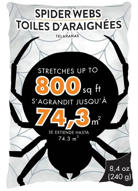 Spider Webs (1ct) Transform your space into a spine-chilling spectacle this Halloween with the White Stretchable Spider Webs. Crafted from high-quality synthetic fibre, this web offers an eerily authentic touch to your decorations. With its remarkable ability to stretch up to 800 sq ft, it is perfect for creating unforgettable Halloween memories, whether indoors or outdoors. Simply uncoil and stretch this web over doors, furniture, and other decorations to achieve fabulously creepy effects. Each pack contains 8.4 oz of webbing, providing ample material to drape across your haunted haven. Elevate your spooky décor and prepare for a thrilling atmosphere this Halloween.